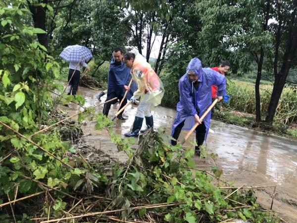 在周坑村高车组,由于涨水,主干道上堆满杂草和淤泥,阻碍通行。大家分工合作,迅速行动,利用铁锹、锄头和扫帚等工具对道路进行清理。
